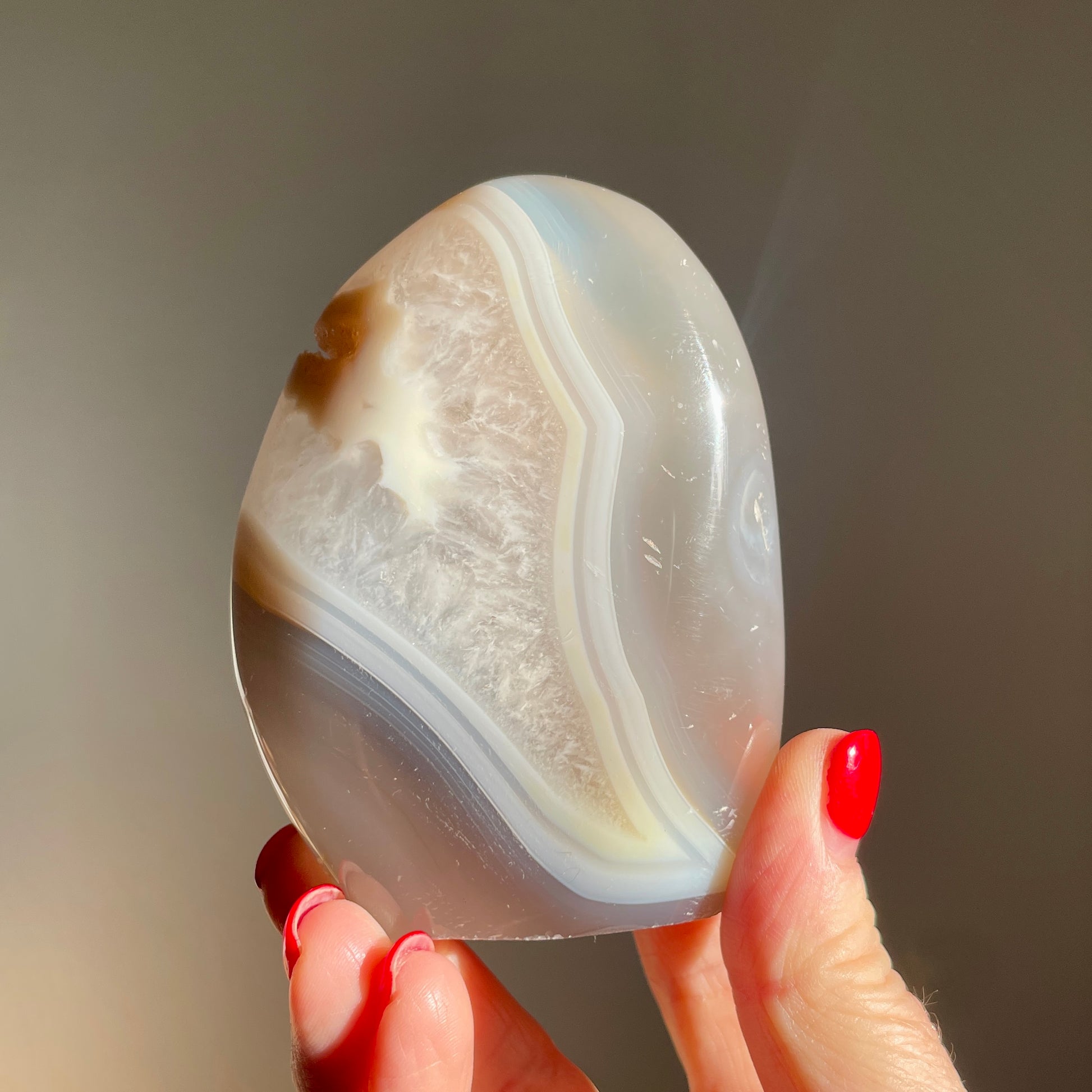 Agate has been cherished since ancient times as a grounding and stabilizing stone. It is known for bringing balance, harmony and protection. Its layered bands are thought to symbolise layers of the self, making it a stone of gentle healing and inner exploration.