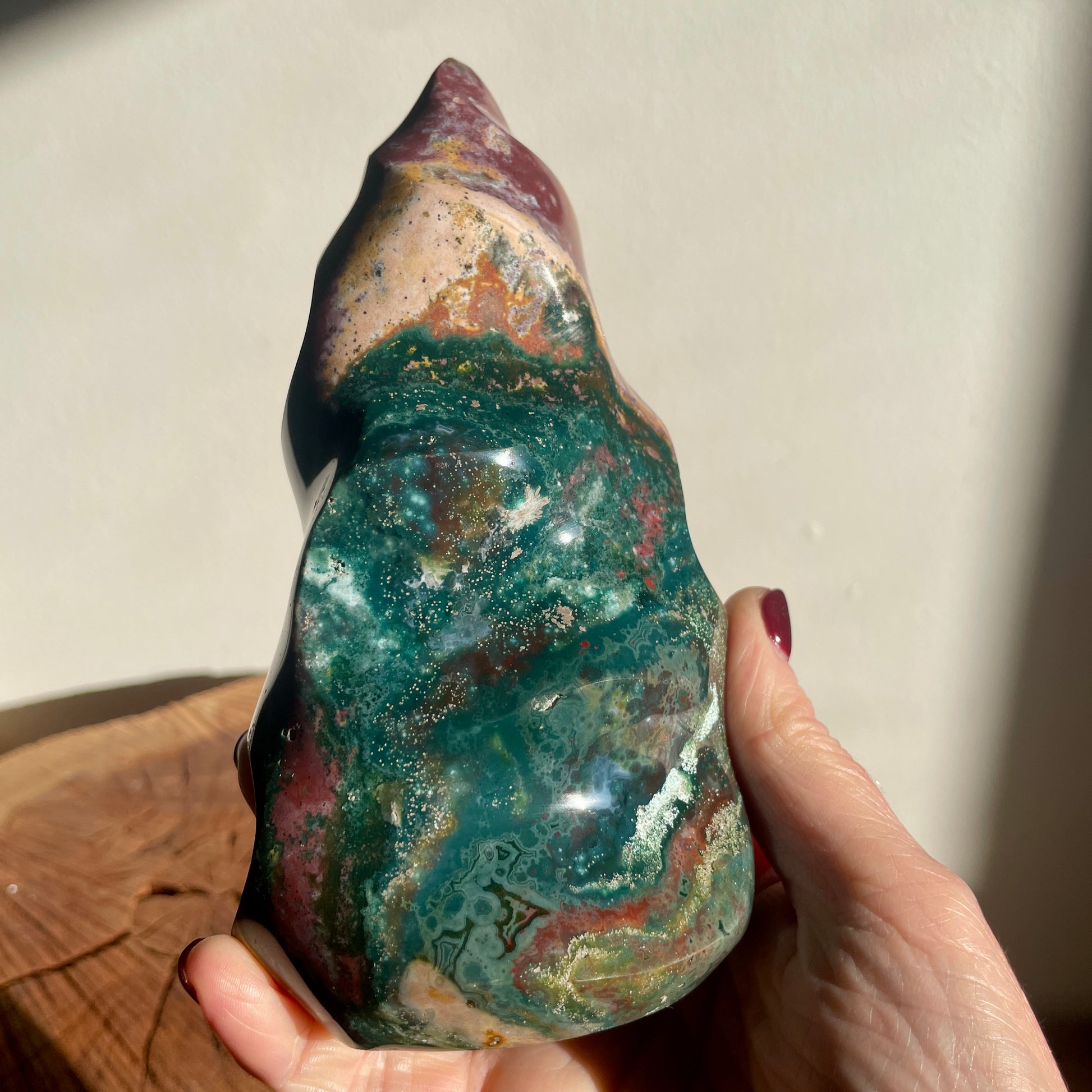 Ocean Jasper is a nurturing heart opening stone that invites love and happiness into your life. Similar to standing by the ocean and feeling that calm, serene energy, Ocean Jasper crystal gives off both an energy of tranquility and bliss. It helps you to find contentment with where you are right now, rather than worrying about the future or despairing about the past, and encourages you to embrace happiness.